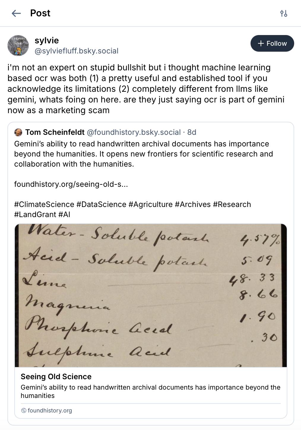 The pushback is real. There is tremendous hostility to AI in the higher education and cultural heritage communities. The reception my recent post on "Seeing Old Science" received on Bluesky is a case in point. I wrote about how Gemini's ability to read handwritten documents could unlock scientific data buried in agricultural extension records. The responses ranged from thoughtful skepticism to outright hostility—accusations of naivety, of ignoring the environmental and labor costs of AI, and even of being a tech company shill despite my career-long commitment to building open source software for education and cultural heritage.