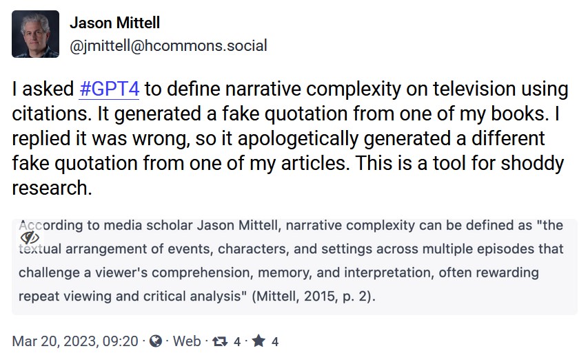 Much of the discourse among journalists and in the academic blogs and social media has revolved around picking out the mistakes these technologies make. For example, my good friend at Middlebury, Jason Mittell, along with many others, has pointed out that ChatGPT tends to invent citations: references to articles attributed to authors with titles that look plausible in real journals that do not, in fact, exist. Australian literary scholar, Andrew Dean, has pointed out how ChatGPT spectacularly misunderstands some metaphors in poetry. And it’s true. Generative AIs make lots of extremely weird mistakes, and they wrap those mistakes in extremely convincing-sounding prose, which often makes them hard to catch. And as Matt Kirschenbaum has pointed out: they’re going to flood the Internet with this stuff. Undoubtedly there are issues here.